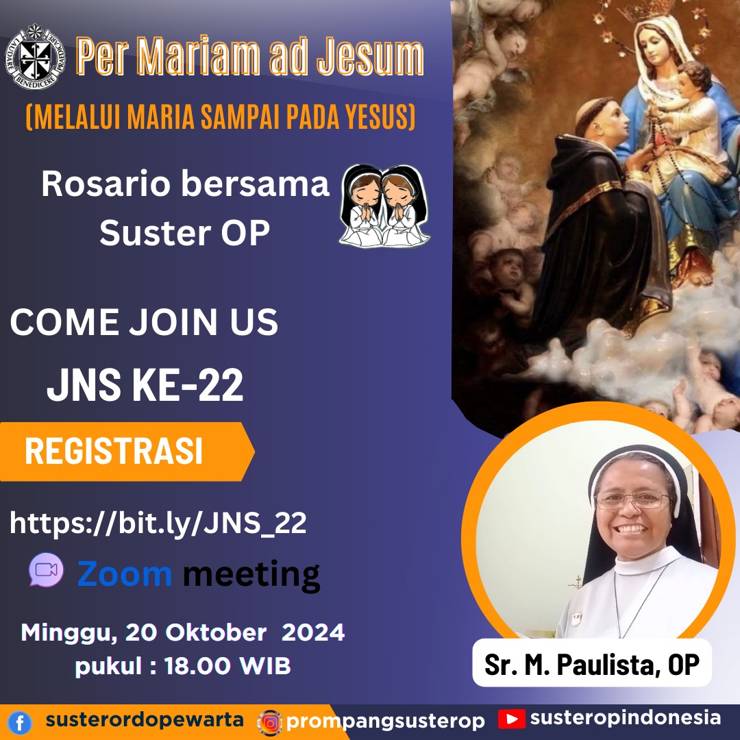 Yuk… berdoa Rosario dan mendengarkan sharing pengalaman doa Melalui Maria Sampai pada Yesus bersama Sr. Paulista, OP pada JNS ke-22 😁